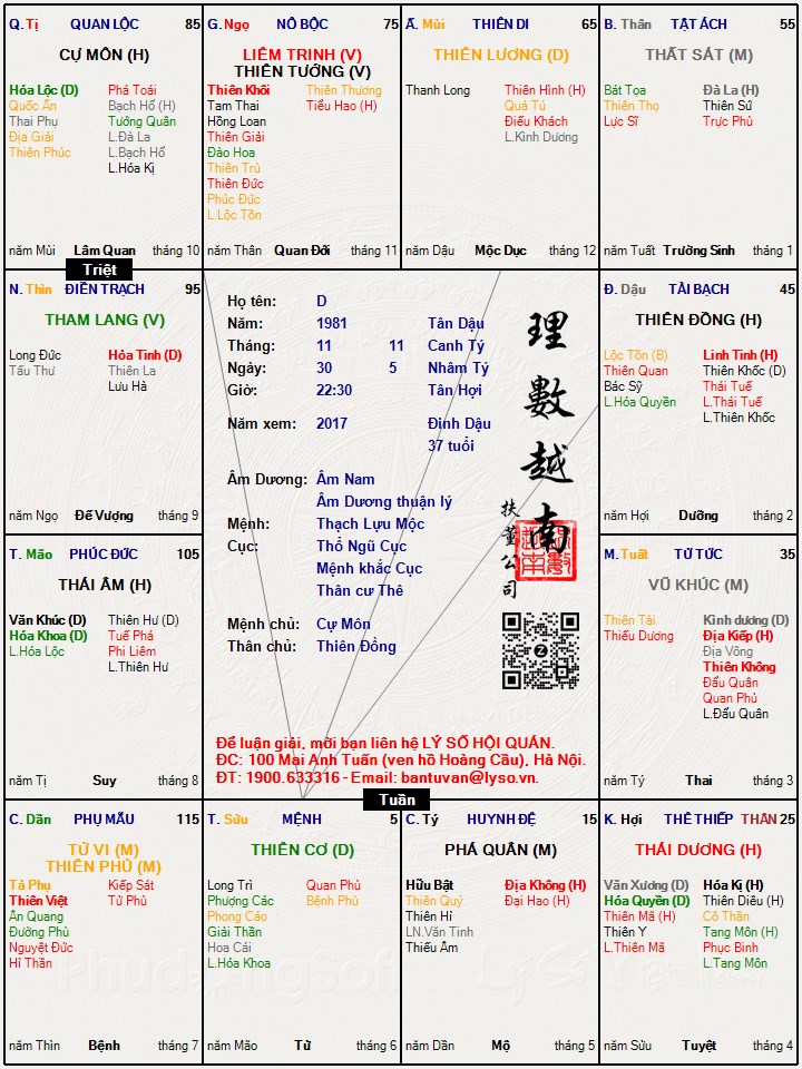 Như vậy, với lá số của bạn đều chứa đựng đủ 2 đặc tính của Cự Môn: Cãi nhau và phản bội.xtiennguyen đã viết: 17:35, 20/06/17TuKyLan đã viết: 17:15, 20/06/17 Lá số của bạn này gợi ý bổ sung một hướng nghiên cứu nữa. Đó là cách cục chia tay rồi quay lại nhưng lý do chia tay là ny bạn này có người khác.