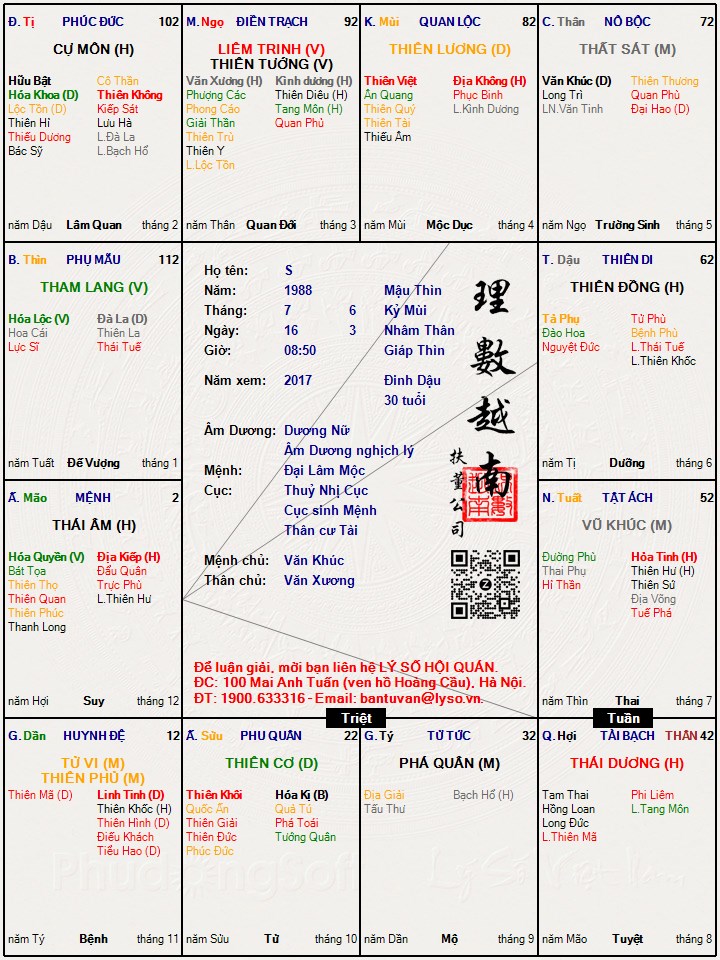 E gửi a ạ. A xem giúp e xem e còn hi vọng gì vào chuyện tình cảm nữa không ? E cảm ơn a ạ!TuKyLan đã viết: 09:08, 22/09/17Phải có lá số mới đánh giá được, chứ mô tả thế thì tôi chịu đấy.thuynga83@gmail.com đã viết: 00:03, 22/09/17A TuKyLan ơi, lá số của e gần giống lá số của bạn ấy, các chính tinh thì giống hệt nhưng mệnh e tại tý có tuần triệt Liêm Tướng, cô quả chiếu phu thê ( tham lang đơn thủ) có phục binh hoá kỵ. Có phải vì thế mà e lận đận tình duyên k a? E không up được lá số lên.