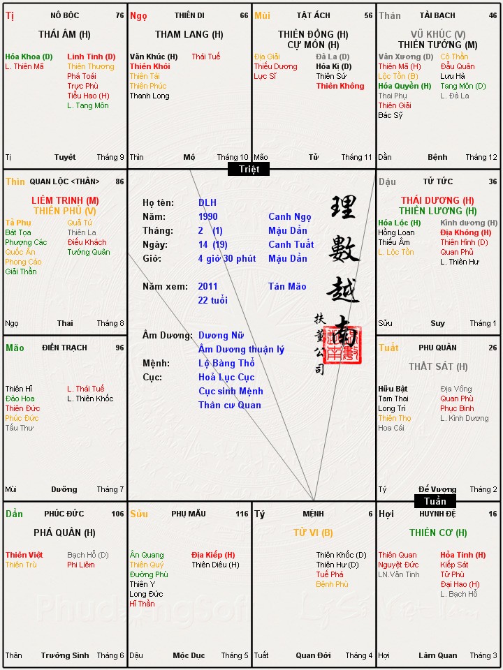 Mặt thì đây. Mình tự coi thấy lá số báo chết năm 40 tuổi lại còn chết 1 cách kì bí và ở xa nhà ( có Tuần ở cung Thiên di thì phải ). Hơi hoảng. Mà kì cục, lá số ở đây xem khác so với cái này, mình bốc ở chỗ khác. Khác cung và khác cả sao 1 chút