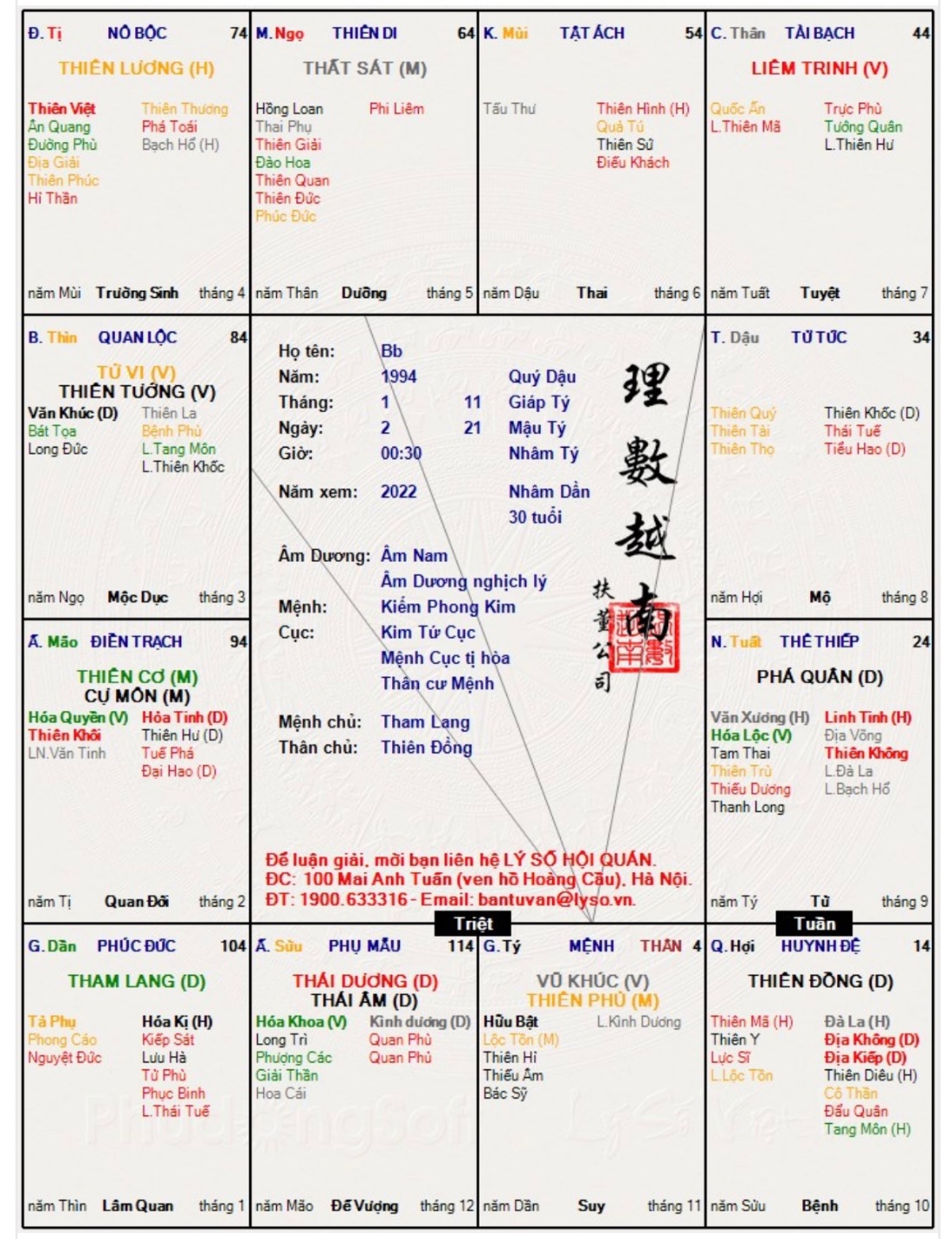À còn chuyện này nữa . Ở ls giờ Mão này anh cũng thấy mẹ em đẹp và giỏi nữa . Nhưng nhìn cung Tử trong ls của bác , anh thấy có một người con hơi lười ( Tam Thai Bát Tọa đồng cung ở Tử ) . Mà em thì siêng lăm mà em là mẫu người làm việc không mệt mỏi . luôn . Cụ Thiên Lương xếp em thuộc mẫu người có năng lực Thiên Lý Mã luôn ấy ( ngựa thi đi vạn dặm không ngừng nghỉ. ))