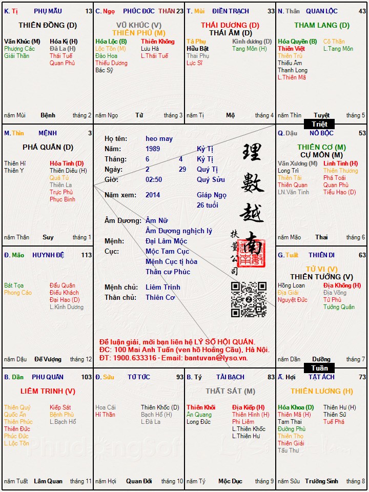 nguyentungh88 đã viết:Tây Đô đạo sĩ đã viết:Do nhu cầu tư vấn của các bạn khá nhiều, hôm nay tôi lập chủ đề này giải đáp cho 20 lá số, mỗi lá số một câu hỏi về một vấn đề đương số bức xúc. Dĩ nhiên các câu hỏi phải thuộc phạm vi mà thuật Tử vi có thể giải đáp được.