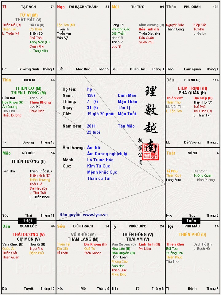 Nhờ anh Phongkiem luận giúp em, em quan tâm đặc biệt về cung Phu thê, Tử tức và tài bạch ạ.