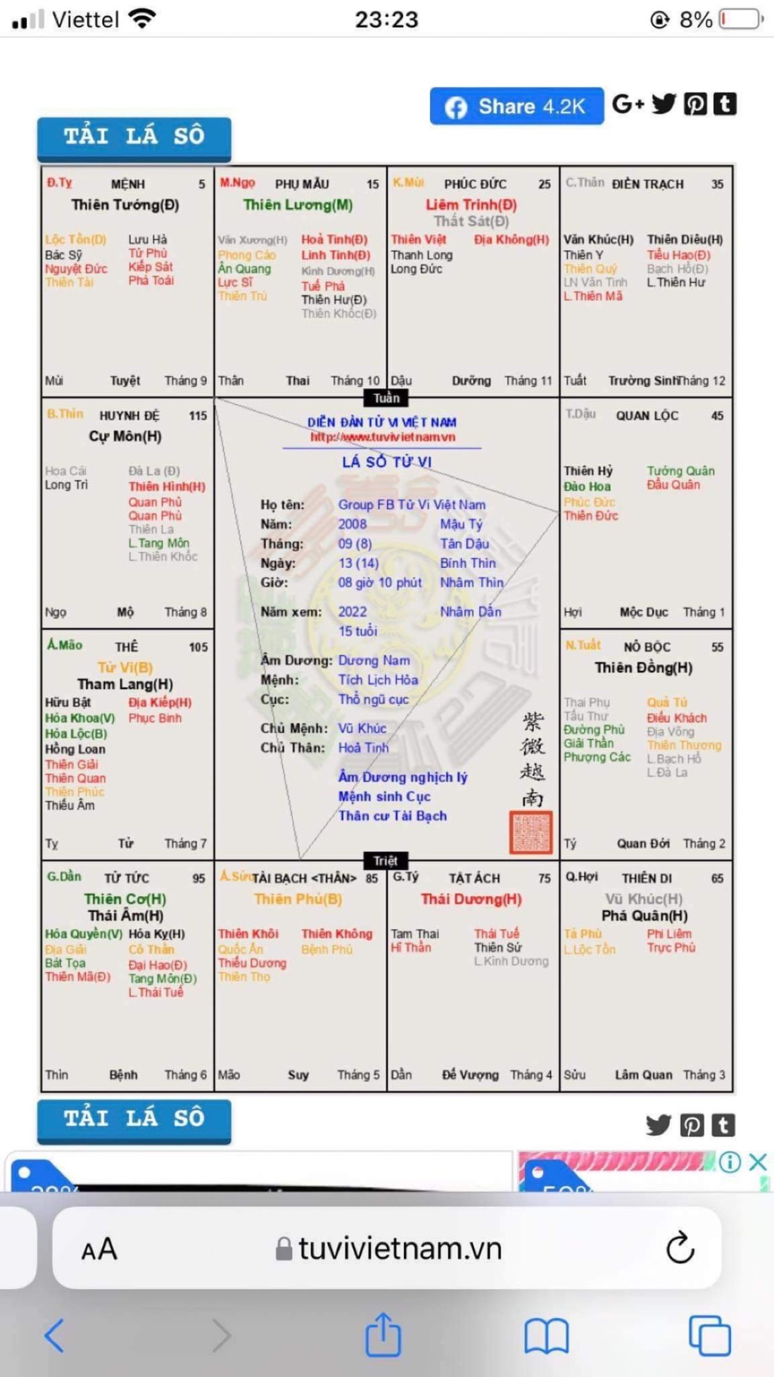 mệnh này sáng lắmduongluongkhoa73 đã viết: 19:06, 12/05/22Có bị yểu mệnh như mẹ em đi xem ko ạ ? Em cảm ơn bácSở Khanh đã viết: 17:52, 12/05/22Mệnh song tướngduongluongkhoa73 đã viết: 16:08, 12/05/22 Em trai cháu sang năm vào lớp 9, đợt trước mẹ cháu có đi xem về chọn định hướng nghề nghiệp cho em thì thầy có nói dễ yểu mệnh vào đại vận 24-35Gia đình rất lo lắng nên hôm nay cháu đăng lá số lên mong đc các bác xem giúp và cho lời khuyên chứ gia đình cháu ăn ko ngon ngủ ko yên ạ