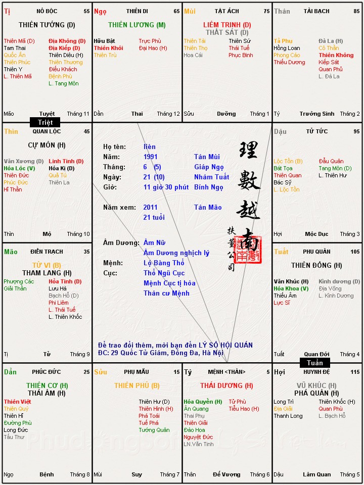 Cung Phu của bạn VCD ,an dần , có 3 sao Phúc đức , là người hiền lành và cực tốt , cũng tương đối giỏi ( hình như tài vặt :p ), có điều anh ý sức khỏe ko tốt lắm , có thê trong cuộc sống sẽ có đôi lần bị mổ sẻ , thọ cũng kém ( sory nhé , nói điều này hoi thất đức , cho xin lỗi trước ,có lẽ mình coi ko đúng :p )