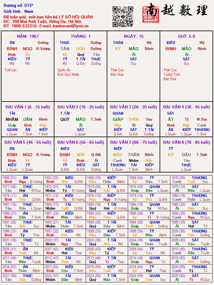 - Vậy trong năm nay,hoặc sắp tới....tình hình có xoay chuyển theo hướng tốt hơn hay không.Lão Bản QN đã viết: 12:39, 15/02/22Về tứ hoá năm sinh : Lộc cung huynh đệ kỵ cung tài , dòng chảy về ngã cung chủ dữ được tiền ...nhưng can cung tài tự hoá lộc , kỵ cung phụ mẫu dòng chảy về tha cung chủ tổn thất ...can cung mệnh hoá kỵ nhập tuyến tử điền nên cháu mới nói chú vất vả về gia đạo , đại vận 43-52 chú biến cố nhiều nhất !datuongphung2009 đã viết: 11:17, 15/02/22- Cám ơn @Lão Bản QN nhiều !!!Lão Bản QN đã viết: 00:10, 15/02/22 Chào chú đầu Xuân năm mới chúc chú cùng gia đình an khang , bình an , vạn sự như ý ...nhìn qua lá số chú có cách làm ăn phá sản , vợ chồng chú lục đục , chú vất vả về gia đạo , thời trẻ chú học hành khá tốt nhưng càng về sau cuộc sống không được như ý ... năm nay lưu mệnh tại mệnh , năm nhâm dần : can nhâm ( vũ khúc hoá kỵ nhập mệnh ) lưu thiên di tại thiên di nguyên bàn hội sát tinh chú ra ngoài cẩn thận ...không biết mẹ chú còn không : năm nhâm dần , đinh hỏa là ấn ( mẹ mình ) bị nhâm hợp nên cẩn thận sức khỏe của mẹ...tứ trụ năm nay sát vượng có gốc thân nhược đặc biệt hung !