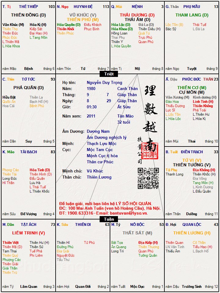 UH!Không phải của em mình đâu.Mà của anh họ mình post lên.Bạn xem cụ thể giúp mình lá số đó thế nào: về công danh,sự nghiệp,gia đình với.Xem về sau thế nào? Mình cảm ơn nhé!
