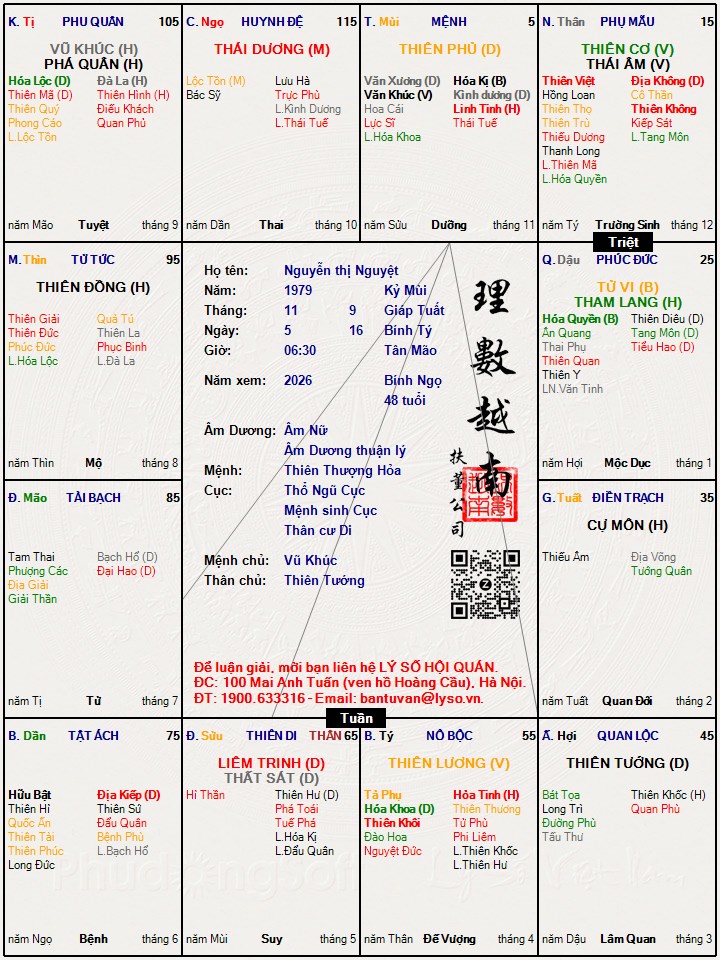 Thân cư Thê, đại vận này sắp qua rồi mà sao không lập gia đình đi. Thê của anh cũng khá tài giỏi, xinh xắn, nóng tính, chọn hợp tuổi mà lấy (bằng tuổi thì ok rồi), không cần băn khoăn nhiều về lá số. Số anh được nhờ vợ.