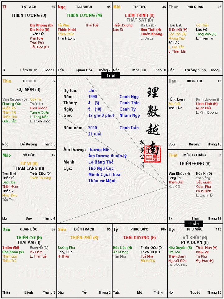 giờ sinh này của mình là chính xác, vì khi mình sinh ra bố mình có ghi lại giờ cẩn thận, đây cũng là giờ sinh mà mình dùng để xem lá số và cũng khá chính xác, nhưng mình nghĩ do mệnh thân bị tuần triệt hãm cho nên nhiều khi thấy việc thành công đến nơi rồi mà còn hỏng, còn nhiều khi chả cố gắng gì nhiều mà lại được thành công. nhờ bạn xem giúp mình với
