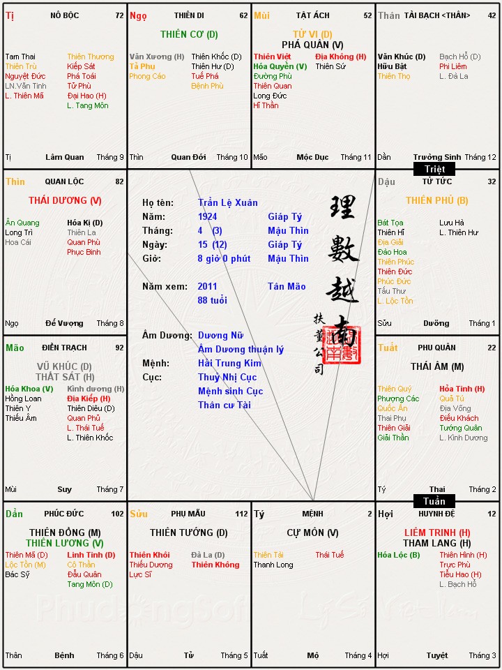 Không biết đây có phải lá số của Trần Lệ Xuân không ạ. Vài dòng về tiểu sử cựu đệ nhất phu nhân của Việt Nam Cộng Hòa: