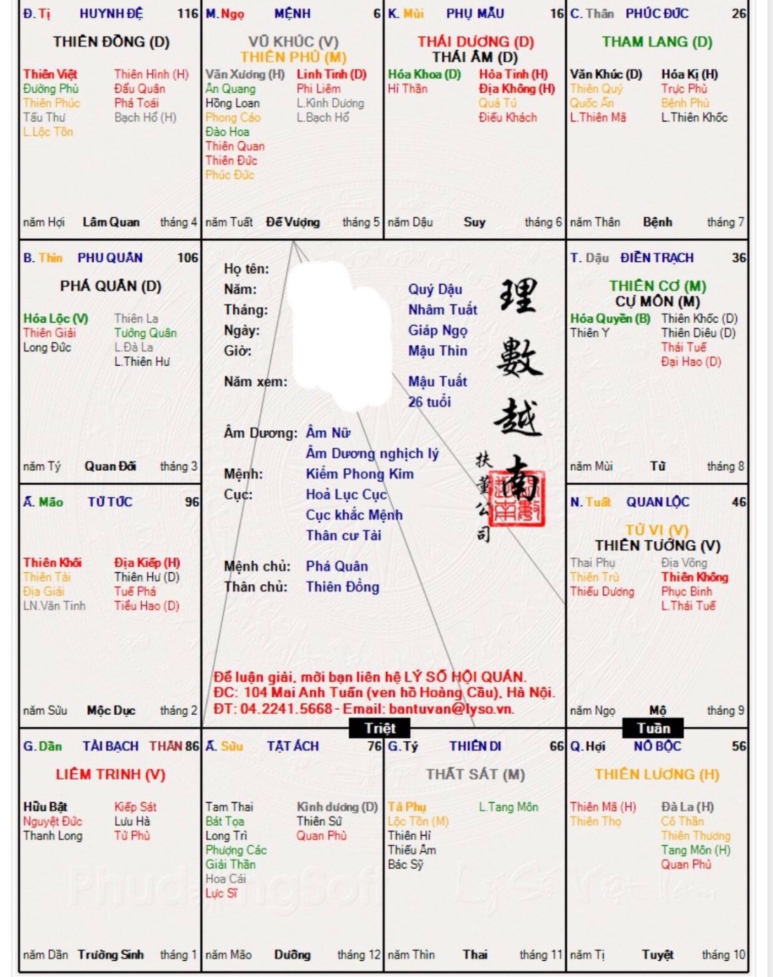 Tôi cũng rất "dị ứng" khi người đi hỏi số che ngày tháng năm sinh. Trên này đã là ảo rồi, còn muốn tăng độ ảo của lá số lên thì cũng đến chịu. Đương nhiên tôi có thể xác định ngay ngày tháng năm sinh không mấy khó khăn. Nhưng thấy mấy lá số che thông tin là tôi bỏ qua vì không thấy được sự cầu thị từ người hỏi số.thusinh96 đã viết: 01:23, 31/07/18em thua=)) nói thật trình em cùi.. e dựa vào tứ trụ để tra.. nhưng nếu đưa lá số mà che mất sinh thần, tứ trụ thì ko hay.. dựa vào đó để cân xương tính số, kết hợp dụng thần trong tứ trụ..ô long đã viết: 23:59, 30/07/18Tôi cũng thi thoảng tự luyện tập lại cách an lá số bằng cách đoán ngày tháng năm sinh cho lá số che hết thông tin ở Thiên Bàn. Thấy anh nói vậy, đúng là người cùng chí hướng. Anh xác định xem lá số này ngày tháng năm sinh là bao nhiêu, và mất mất phút để tra ra?thusinh96 đã viết: 23:28, 30/07/18 đúng quy định diễn đàn đi chị. cho thông tin tính cách, học vấn, một vài cột mốc trong đời