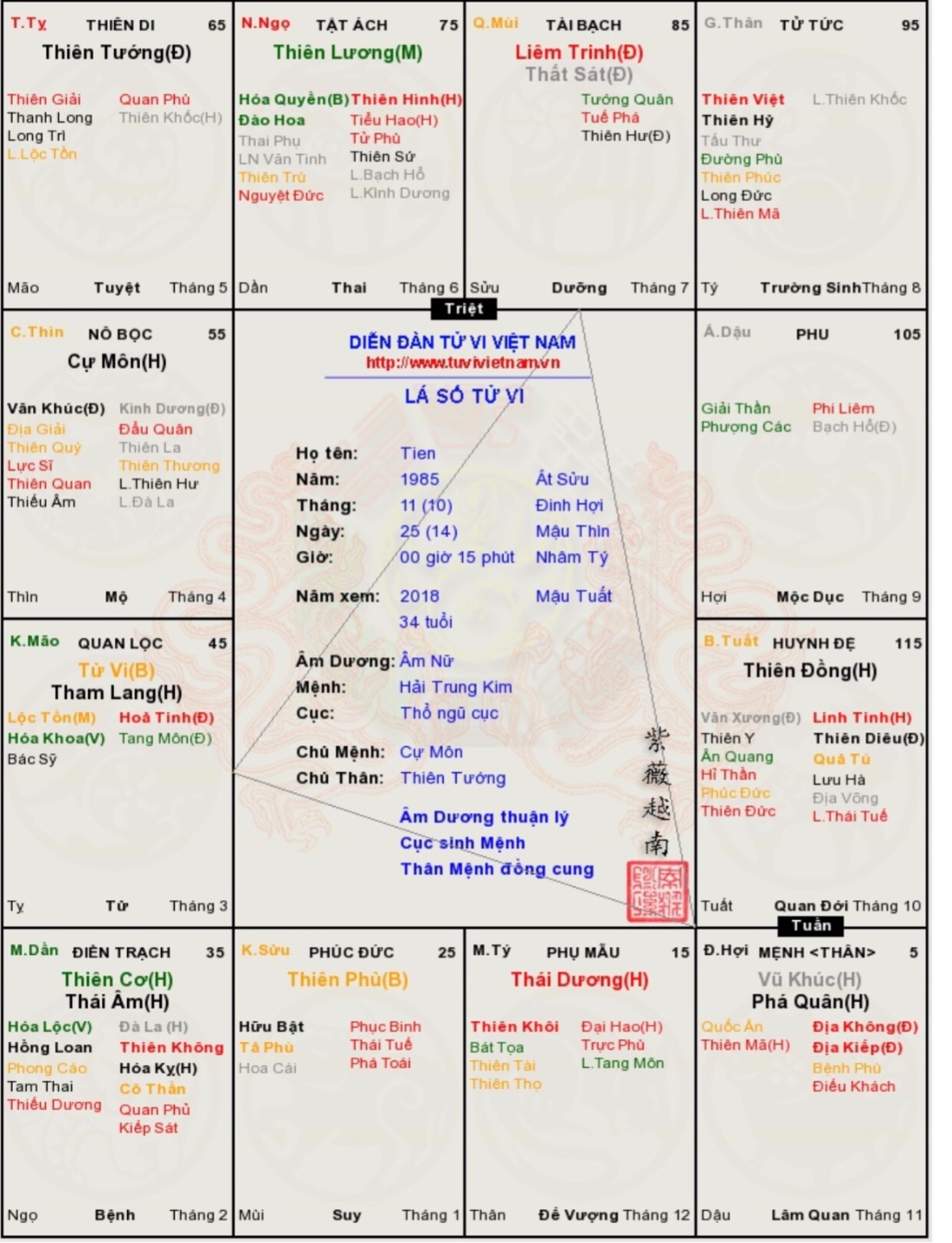 Nhờ chủ toppic xem giúp em đại vận mới 36-45 và xem giúp em lá số . Đại vận mới có đủ cả không kiếp nên em có chút lo lắng . Xin được giúp đỡ . Em xin chân thành cảm ơn .