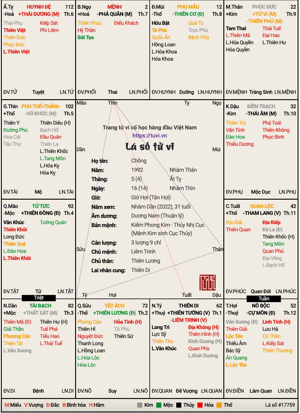 Theo mình không nên níu kéo anh chồng này làm gì bạn ơi, mệnh điếu khách, thân riêu y thế kia sau này không thay đổi đâu, cờ bạc, gái gú đủ cả, chị bạn ra ngoài đào hoa vậy thì không cần lo đâu. Chưa có con đây là điều may mắn, ở lá số chị bạn có thiên hình năm nay báo hiệu có liên quan đến pháp luật nhưng năm sau sẽ ra tòa đòi chia tài sản.kimpossible đã viết: 17:15, 12/11/22 E có người chị chơi thân hiện đang vướng vào cảnh rất tréo ngoe. Chồng chị e từ người hiền lành, chăm chỉ làm ăn đột nhiên trong vòng vài tháng yêu sét đánh 1 em gái và bỏ nhà ra đi biệt tích với ngừoi yêu, phũ phàng với bố mẹ vợ, đòi bỏ vợ..v.v Do bỏ nhà đi không hồi âm (trước khi đi đòi nhất quyết bỏ vợ nhưng giờ đi biệt tăm) nên bạn bè, gia đình chịu không ai hiểu trường hợp này.