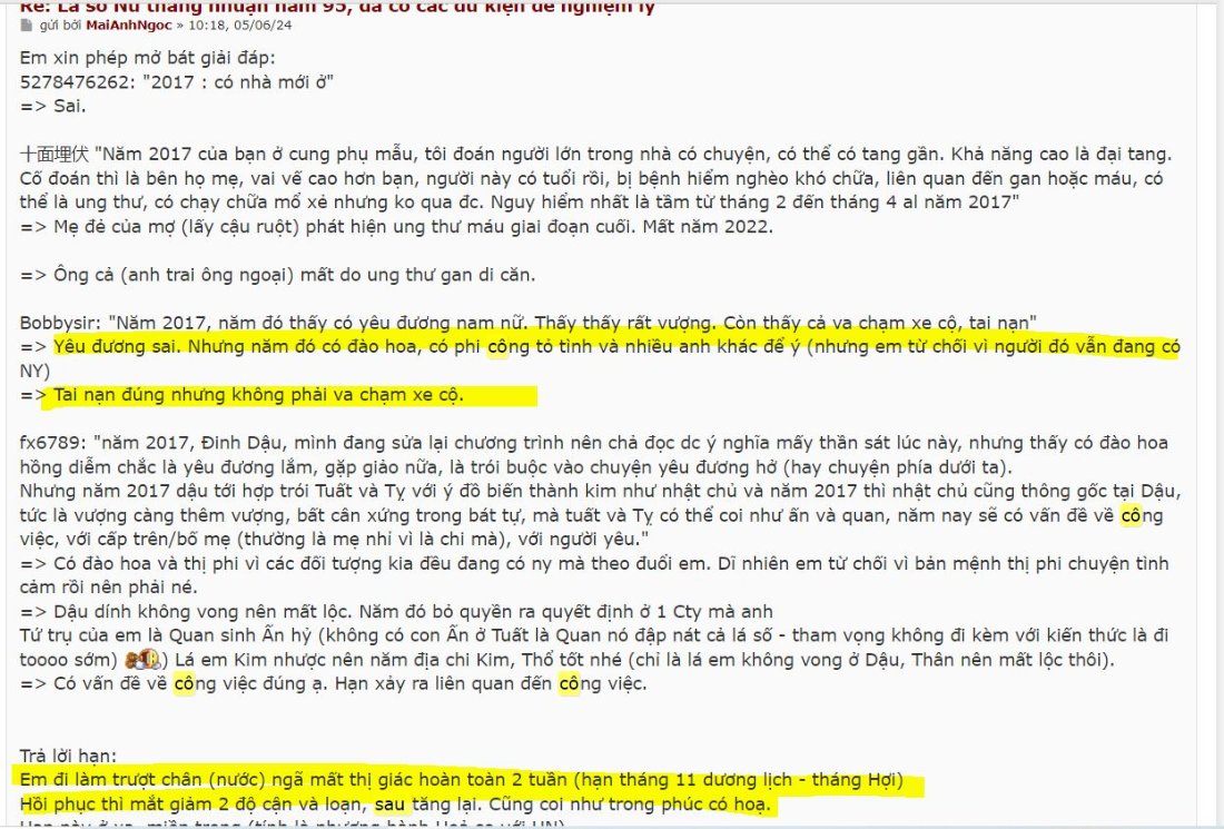 Cái bạn gì sinh năm 95 hỏi về tháng nhuận hay ko nhuận đã phản hồi chưa anh. Khán hạn xong chả cảm ơn cũng chả phản hồi để người xem họ biết mà rút kinh nghiệm. Vì không phải lời nói thốt ra là 100% mà bản thân người xem cũng phải nghiên cứu thêm. Nhưng cô bé có vẻ chỉ muốn tin vào những điều tốt đẹp. Lá số đó e chưa xem kĩ mới chỉ kiểm tra vài hạn thôi. chả biết e nó đi xem ở đâu hay tự xem mà cứ nói là CÁc vận sau suy nên nó không tốt. Nên không thể chấp nhận cái h sinh hay tháng sinh đó. Vận suy hay không, không quyết định cuộc đời e nó tốt hay xấu được. Nếu xem tử vi như vậy thì ai cũng xem được. Chưa đâu vào đâu, đã bột phát như vậy. Nếu tiếp tục trải lòng thì mọi lo lắng đều tan biến hết.十面埋伏 đã viết: 08:10, 12/06/24 Đan trì chuẩn.