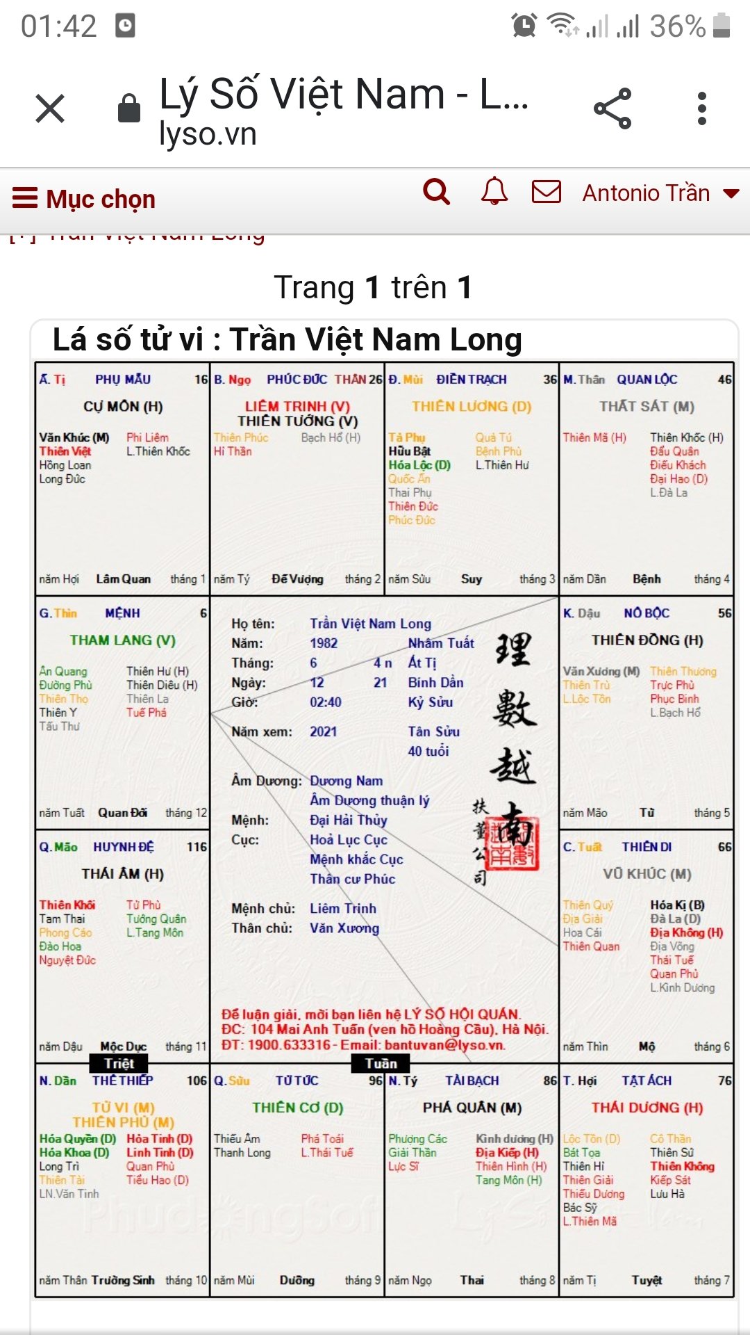 Ông hầu như chỉ có một bà vợ chính thức đó. Bỏ thì ông không nỡ, nhưng lại sủng ái nhị phòng!Antonio Trần đã viết: 20:32, 19/05/21Dạ em cảm ơn anh đã xem giúp rất chính xác ạ. Vậy phiền anh xem em có tất cả mấy đời vợ ạ. Vì hiện tại em đang ở với nhị phòng nhưng chị phòng cũng thuộc mệnh hiếm con và hiện có 1 đứa con trai riêng. Phiền anh giúp đỡ em cảm ơn nhiều lắm ạ!Dokhoavan đã viết: 17:40, 19/05/21Mệnh này là hiếm con. Chính thất may ra chỉ có chút con gái mà cũng khó sinh hoặc sinh non. Có thể có con trai do kế thất hoặc nhị phòng sinh ra!Antonio Trần đã viết: 16:56, 19/05/21 Thưa các vị gia đình nhà em đã 4 đời đơn truyền rồi nên kinh mong mọi người xem hộ giúp em ạ! Xin chân thành cảm ơn ạScreenshot_20210519-014254_Chrome.jpg
