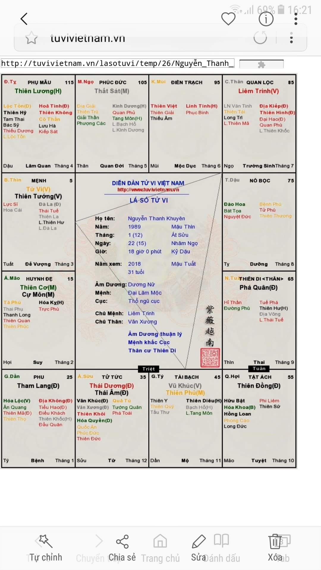 Xét cơ bản về lá số của bạn cục khắc mệnh . Cung mệnh lại đứng ở thế thiên la địa võng. Mệnh tử tướng nhưng thiên tướng đà la là tượng tướng mất đầu.thân cư thiên di thì làm việc và sinh sống ở ngoài nhiều hơn ở nhà hay còn gọi là ly hương. Bố mẹ có thể làm trong nghành y hoặc bốc thuốc hay bán thuốc chữa bệnh nhưng có tiếng không có miếng.nhưng được cái song thân khá yêu thương nhau. Về anh em của bạn tôi đoán là 3 anh chị em. Bạn là chị cả sau là 2 em trai . Chị em không được hòa hợp. Bạn ít bẠn và bạn bè bạn khá là ăn chơi.đại vận 25_ 34 đóng cung phu đại vận này có thể lấy chồng. Mà khả năng cao là năm canh tý ( 2020). Cung phu khá tốt tham lang hóa lộc lại có bộ mã khốc khách thì khả năng cao người bạn đời của bạn là người buôn bán, thương gia rất tài năng nhiều tham vọng và rất có lộc, thường xuyên đi đây đó