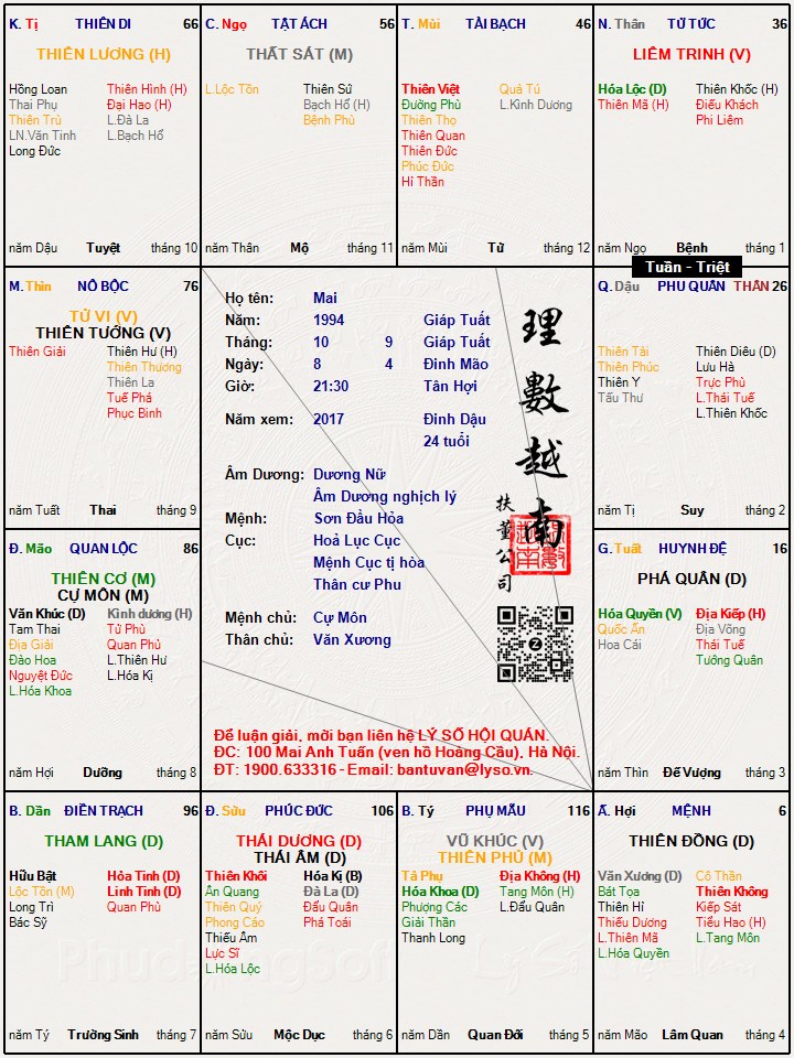 Con kính chào bác Vio !! Con xin bác chỉ cho con vài điểm trong lá số để con có thể Định Hướng cho tương lai với ạ !!vio đã viết: 08:44, 21/03/17Người này giàu lắm.chịcago Mafia đã viết: 08:29, 21/03/17 Mục này hỏi "số này thế nào?"