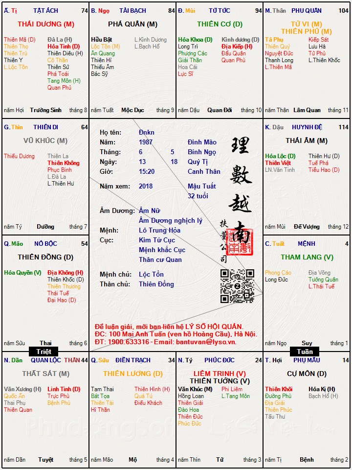 Vận 26 -35 của bạn có cơ hội được đề bạt lên chức, nhưng k làm được chức trưởng (hoặc chỉ thừa nhiệm, ủy quyền). Tài lộc có thể qua đó kiếm được, nhưng sau đó thì rất áp lực, nguy cơ sẽ mất, cả chức vụ lẫn tiền. Nếu có vợ rồi thì nên chú ý cả gia đạo, vì vợ chồng cũng khó lưỡng toàn.minhvuanphufood đã viết: 20:49, 26/03/18Anh TuKyLan không online ạminhvuanphufood đã viết: 00:47, 26/03/18 Xin hỏi bác TuKyLan đây là hạn phát hay hạn xấu của đương số ạ
