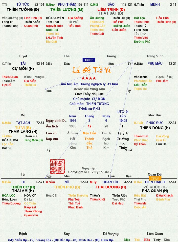 Mệnh vô chính diệu, thân cư phu mà phu thì bị triệt. Phúc đức thì bị tuần... Cuộc đời cũng có chút sóng gió nhưng mình chắc ăn may trời thương nên đều tránh được họa, đôi khi trong rủi có may.