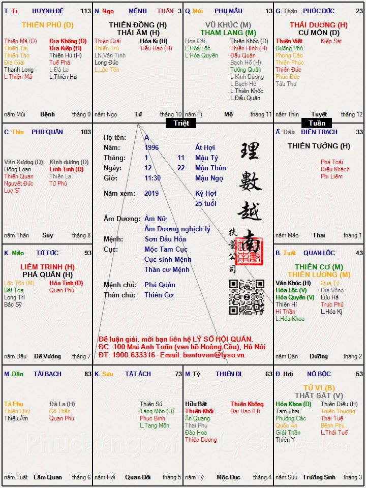 Bạn xem giúp mình lá số trên như thế nào với bạnNgày xanh đã viết: 12:30, 25/07/19 Hãm đắc ko phải chìa khoá để luận đoán. Phải căn cứ vào sự hoà hợp của chính tinh vs các bàng tinh xung quanh. Hãm như đkien ko thuận lợi nhưng có cát tinh hỗ trợ vẫn vươn lên và thành công. Đắc mà ko có cát tinh hỗ trợ như con nhà giàu ỉ lại ăn chơi rồi đốt cháy cả cuộc đời. Vậy bí quyết hay đáp số nằm ở bàng tinh có hợp vs chính tinh đó hay ko mà thôi.