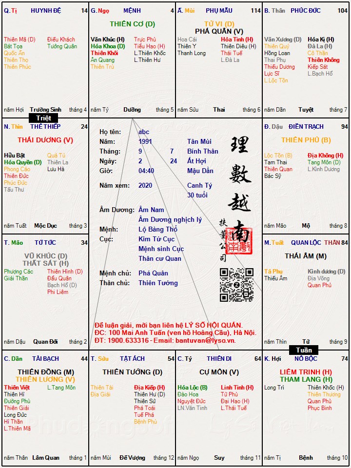 Ls cũng ổn, vòng vận.đi khá đẹp, chỉ tiếc chút âm dương tử phủ gặp tuần triệt, nhưng vẫn ở mức khá đc, vk cũng xinh đấyTô An đã viết: 19:51, 16/06/20Chị ơi coi ls cho em về công danh sự nghiệp và tình duyên ạLinhchauhacbach đã viết: 17:30, 16/06/20 Thời gian vừa qua mình có luận giải từ vi và nhận được khá nhiều sách của mọi người, mình rất cảm ơn. Mình là người thích đọc sách và cũng muốn mọi người xung quanh được đọc nên rất vui khi nhận được sách mọi người gửi. Và hi vọng qua mỗi câu chuyện mình chia sẻ là chén rượu xoa dịu hồng trần cho mọi người. Mình định dành thời gian yêu đương, nhưng thời gian qua toàn là vớ vẫn, bốc một quẻ hỏi tình duyên thì là tu là cội Phúc tình là dây oan, thôi đành quay về cây cầu đá xanh đợi thêm 500 năm vậy. Thời gian rảnh rỗi mình tiếp tục luận tử vi.hij.