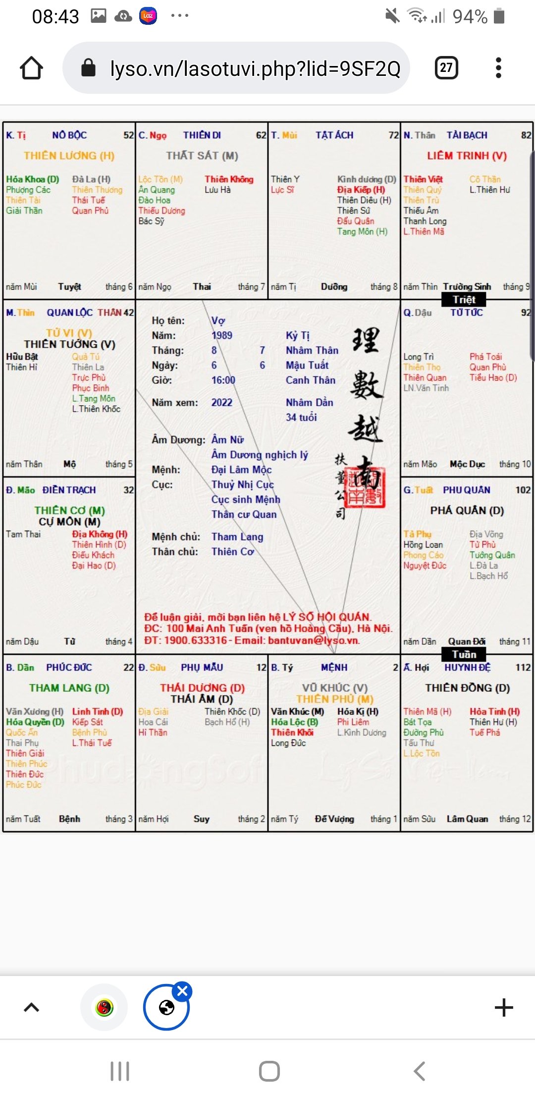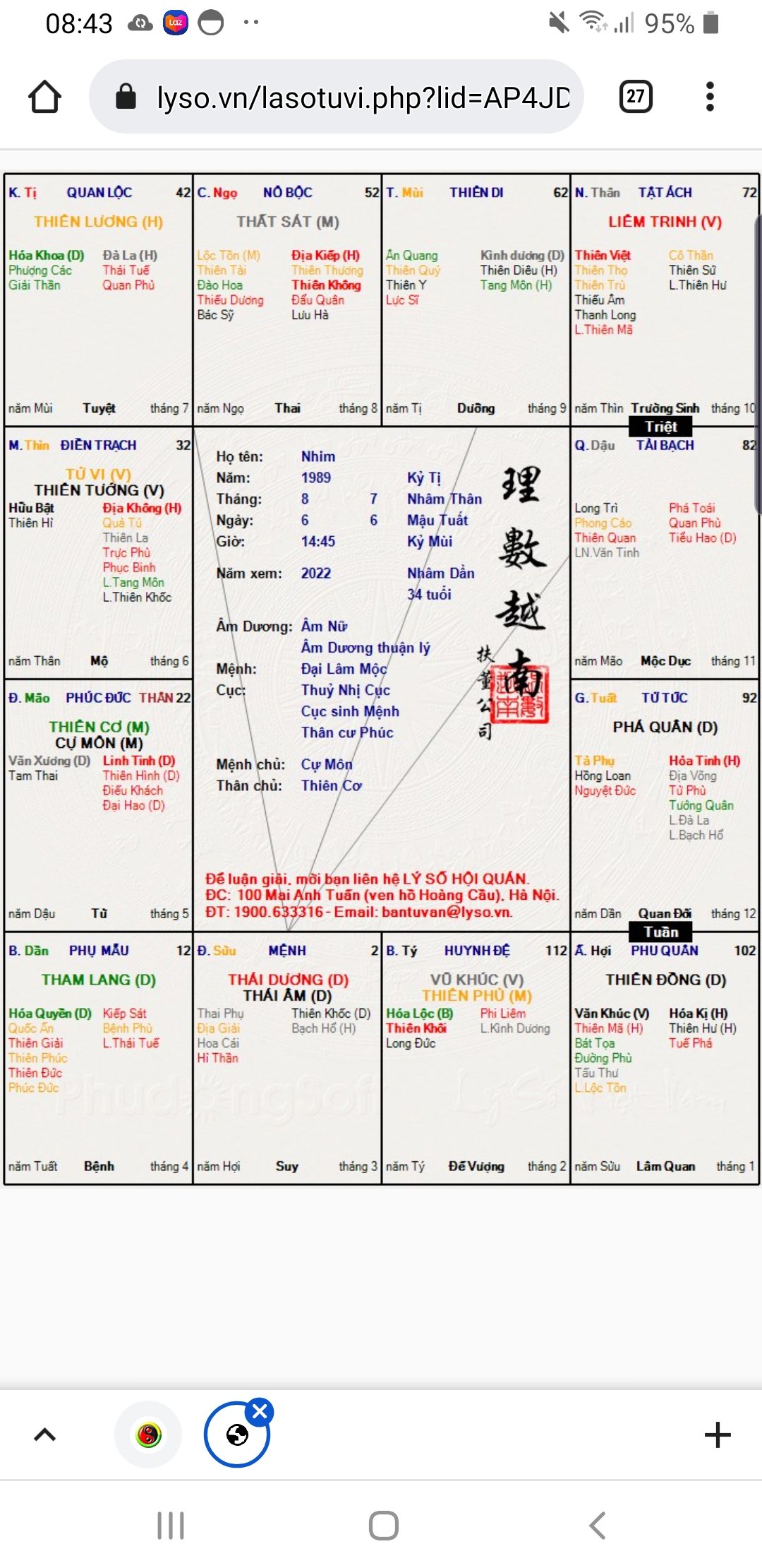 Dạ, em cũng hoang mang chỗ này, mẹ thì nói đúng là 16h chiều, mà khi xem bát tự thì từ vận trình và các sự kiện đã qua thì người xem nói là kỷ mùi ấy ạ.hysshu đã viết: 10:53, 23/04/22Nếu đúng 4h chiều như mẹ em nói thì chắc chắn giờ Thân, mệnh Vũ Kỵ, không thể là lá số giờ Mùi. Còn nếu sinh tầm 3h 2 phút chiều thì còn đắn đo có thể giờ Mùi, có thể giờ Thân.chinh85 đã viết: 08:48, 23/04/22 Em chào cả nhà ạ,