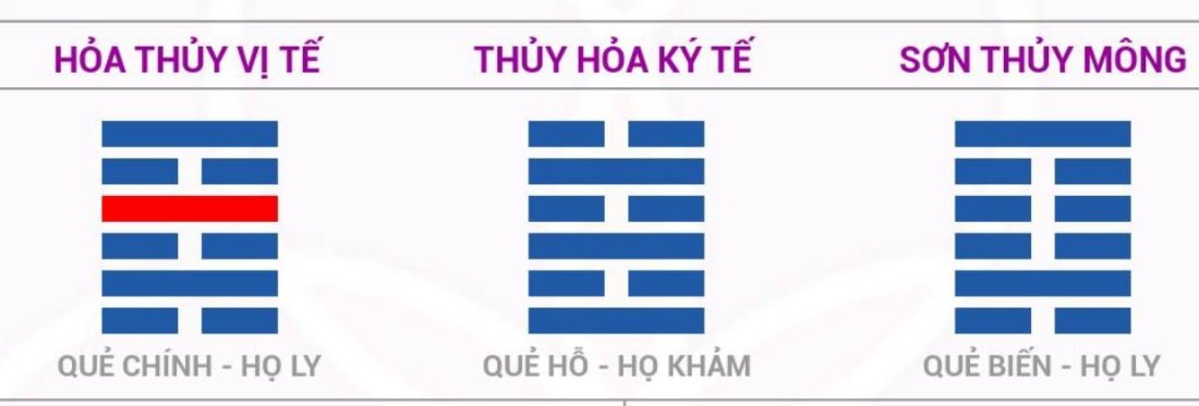 - Tượng quẻ hoả thuỷ vị tế: thất dã, thất bại - Lời hào động: hào 4: hối vong (hối hận mất đi) --> Hiệp 1 chắc chắn thua, khả năng thua nhiều hơn 1 bàn