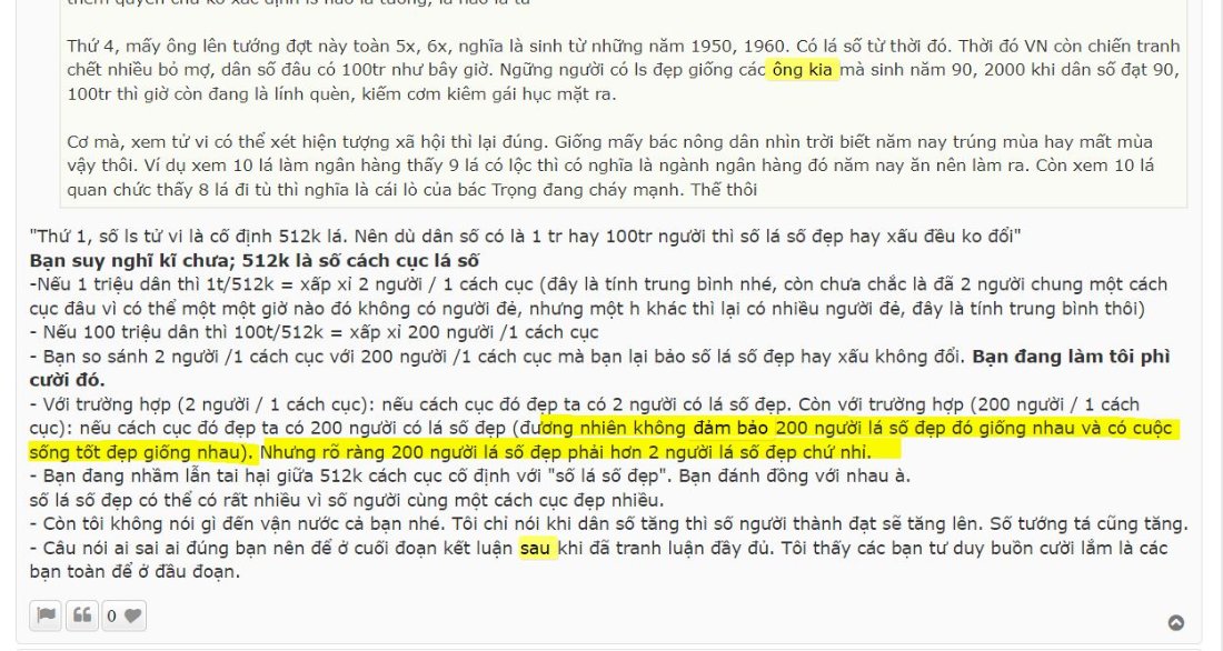 "Thứ 1, số ls tử vi là cố định 512k lá. Nên dù dân số có là 1 tr hay 100tr người thì số lá số đẹp hay xấu đều ko đổi"