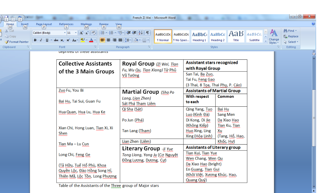 The 14 Major Stars of Chinese astrology, previously described in group 1, 2, 3 have what we call the Assistant stars, and when the major stars are in the same palace (đồng cung), or in opposite (đối cung) with its assistant stars, they can express the powerful benefit at maximum, provided that the law of Yin and Yang and 5 Elements are obeyed