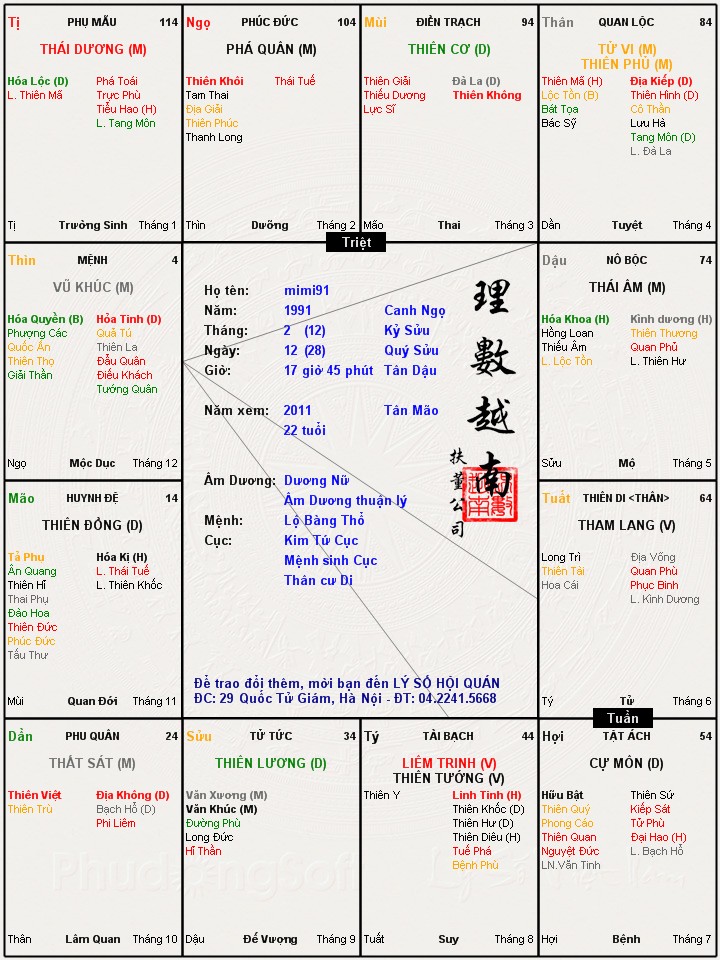 pandar bear đã viết:HSA9x đã viết:cám ơn bác pandar bear đã chọn ngày 12. bác xem hộ cháu lá số xem đường công danh về sau có phát ko ạ?