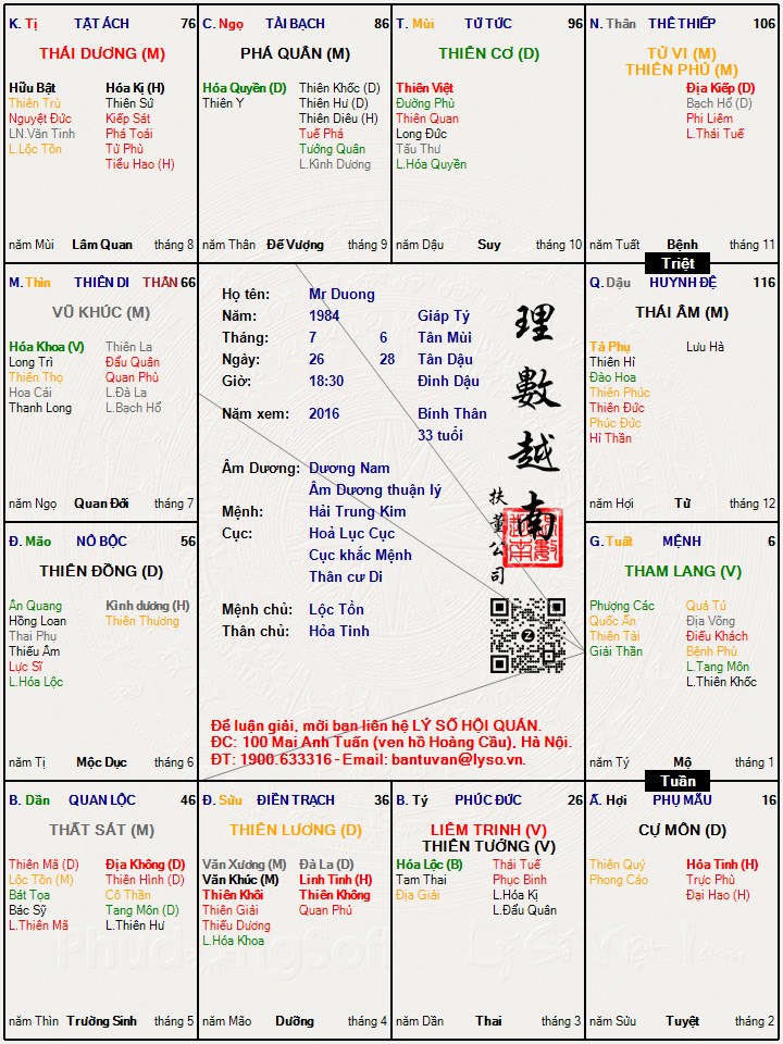 Mình tên dũng ,mong được bác xem và nghiệm lý àthanhtrabatho đã viết:Từ lúc tôi mới sinh ra thì ko biết tử vi là gì nhưng cũng tại số phận đưa đẩy,bố tôi lại là người xem tử vi rất giỏi một hôm nói tôi :số mày giàu sang nhưng chê cái lắm vợ,làm tôi tò mò quá mà mới tìm sách của bố để đọc.bố tôi cấm tôi đọc sách xem bói vì biết là ko có ích nhưng tôi vẫn cố đọc trộm tại vì sự tò mò.lúc đó tôi đang học lớp 9,càng đọc càng thấy nhiều cái kì thú trong đó và ko biết là tôi đã nghiện sách tử vi từ bao h nữa,cũng là vì đọc trộm nên ko đc chỉ dạy đầy đủ nên thua bố mình khoảng tầm 3 bậc.