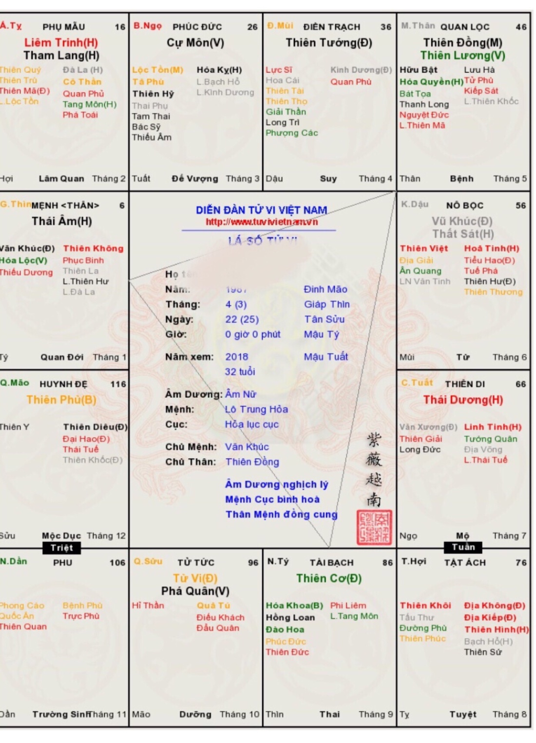 Xem tử vi có sai sót là chuyện bình thường thôi anh, ngày trước lúc em mới sinh ra, ông nội em có đi xem tử vi của một ông thầy rất giỏi (học 10 năm bên Tàu), ông thầy bảo nếu em là con trai thì gia đình sẽ không hạnh phúc giống như anh nói.hungmanh82 đã viết: 15:12, 15/05/18Số này xuất ngoại cực tốt rồi.sẽ thoát khỏi hết nhưng nếu bạn lấy ck sớm vậy thì chắc chắn ck bạn phải nể vợ lắm.chưa biết rõ năm sinh bố bạn mà tôi phán bừa xin lỗi bạn nhé!kinh nghiệm tôi xem chủ yếu là học mót ít từ các thầy đã khuất nên còn nhiều thiếu sót ,ko có gì để học hỏi đâu nhé!hjDung Ana đã viết: 11:33, 15/05/18Ba mẹ em vẫn sống bình thường à anh, ko có bỏ nhà ra đi gì hết ( chắc là do có lưu hà, tang môn, cô quả? Hội Khốc Hư) Em nghĩ sao Lộc tồn đã giúp giải được hạn này). Gia đình em bình dân nhưng em sướng từ nhỏ đến giờ do là con út đc cưng chiều và học hành cũng khá ( Mệnh em ko đẹp nhưng hội đủ Quang Quý Thai Cáo, Tứ Đức, Thiên Quan, Thiên Phúc nên em năng lực tâm linh khá tốt và cảm thấy mình được ơn trên che chở nhiều). Em lấy chồng có con và cuộc sống không có gì phải phàn nàn, giàu không giàu nhưng cũng ko thiếu thốn, gia đình em trộm vía rất hạnh phúc, gặp được chồng em chắc là do em phước ông bà ( em luôn thầm cảm ơn ông bà, ơn trên), vì em cũng là người ko ham danh vọng, cầu phúc ko cầu tài nên với em cuộc sống như vậy là ok rồi). Công danh đúng là có phần lận đận, là do em theo chồng đi nước ngoài nên bỏ việc.hungmanh82 đã viết: 08:47, 15/05/18