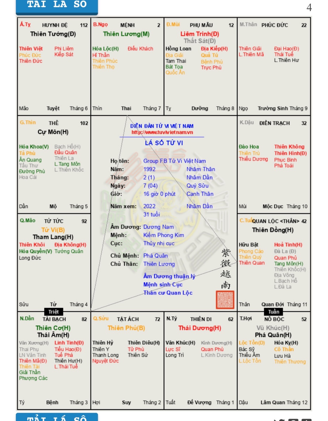 Chồng cháu sinh năm 92 ạ, cháu gửi chú lá số chồng cháu, mong chú hữu duyên cho đôi lời về lá số của chồng cháu với ạ, cháu cảm ơn chú nhiều.!dunglanchin đã viết: 19:30, 28/08/22Haanh0512 đã viết: 19:18, 28/08/22Dạ, cháu lấy chồng đầu năm 2019, tháng 12/2019 cháu sinh bé trai đầu lòng ạdunglanchin đã viết: 19:11, 28/08/22