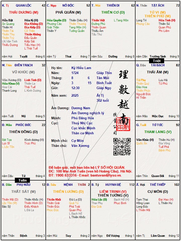 Lá số con trai chị thể hiện là người có bằng cấp nên chắc cũng học được đại họcTLXD đã viết: 19:38, 30/11/22Con trai thành tích học bình thường, thi đỗ vào trường công lập trung bình khá ở HN. Tố chất khá thông minh nhưng hầu như kg tận dụng đc khả năng.Thi lớp 10 điểm trung bình, 40 điểm thôi ạ.hysshu đã viết: 12:10, 30/11/22Bạn và con trai bạn sn 2007 cũng mệnh Thiên Lương cư Sửu. LS con trai bạn cũng khá ( cung phu thê có Kỵ ko hay lắm, cung quan Đà Linh cũng có nhược điểm). Con trai bạn học có tốt không, có học trường chuyên lớp chọn gì ko? thành tích học tập có cao không, nó học tốt môn gì nhất? Cháu thi lớp 10 điểm có cao không?TLXD đã viết: 13:02, 30/09/22 Đây là lá số của con trai mình. Trùng hợp là cháu cũng có cách cục giống mình và chiều đi của các đại vận cũng vậy. Tuy nhiên tuần triệt an ví trí khác, mà thân cư Phúc, phúc lại bị tuần. Mình để lá số của cháu ở đây, mong các cao nhân đi qua luận giải giúp mình.